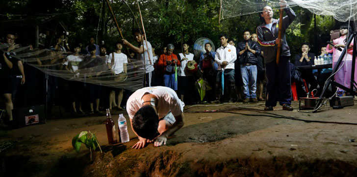 Los padres de los 12 niños atrapados en un cueva en Tailandia desde hace tres días organizaron este martes una plegaria en el lugar mientras siguen las tareas de rescate.
