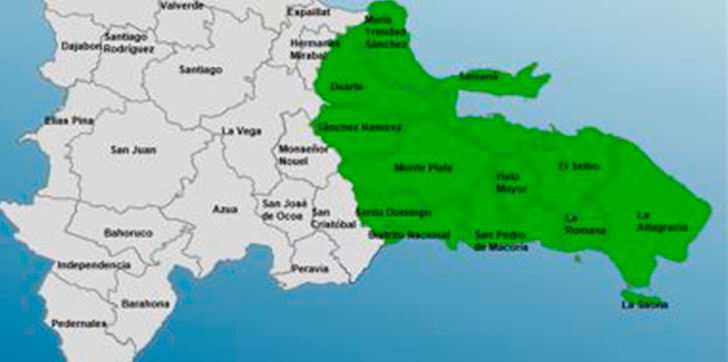 Estas localidades son la provincia de Santo Domingo, María Trinidad Sánchez, San Pedro de Macorís, El Seibo, Hato Mayor, La Altagracia, La Romana, Duarte, Sánchez Ramírez, Samaná, Monte Plata y el Distrito Nacional.