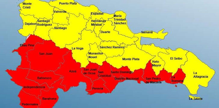 Las provincias en alerta roja son: La Romana, San Pedro de Macorís, Santo Domingo, Distrito Nacional, San Cristóbal, San José de Ocoa, Peravia, Azua, Bahoruco, Barahona, Independencia, Pedernales, San Juan y Elías Piña.