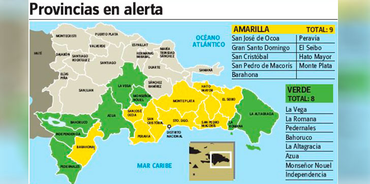 En alerta verde están las provincias La Altagracia, La Romana, Baoruco, Independencia, Pedernales, Azua, Monseñor Nouel y La Vega.