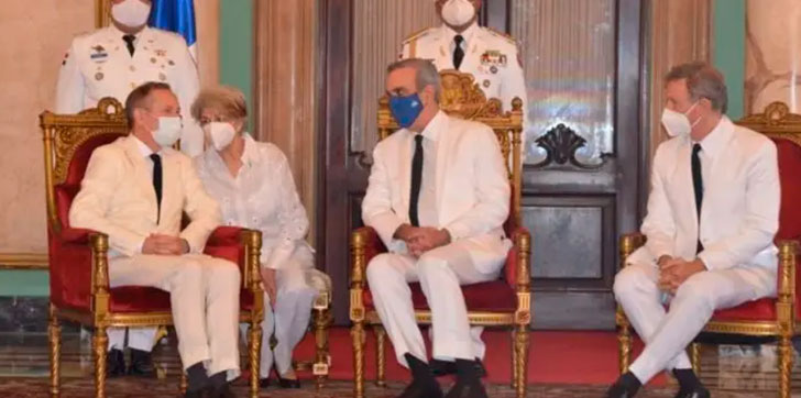 A la entrada al Salón de Embajadores, cada diplomático, acompañado del embajador director de ceremonial del Estado y Protocolo, era recibido en ese lugar por el presidente Abinader y el canciller Álvarez.