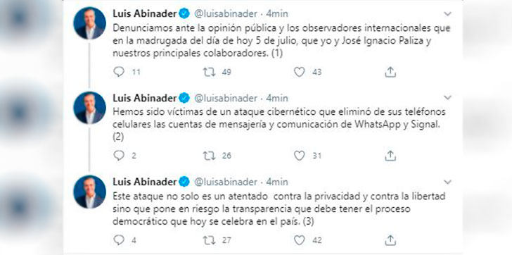 “Denunciamos ante la opinión pública y los observadores internacionales que en la madrugada del día de hoy 5 de julio, que yo y José Ignacio Paliza y nuestros principales colaboradores”, manifestó el candidato.