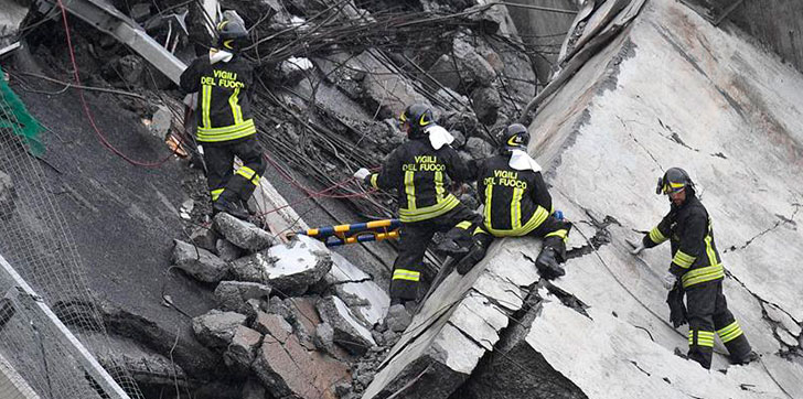 El siniestro ocurrió en el puente Morandi, de 1.182 metros de longitud y una altura de 90 metros, y del que se vino abajo un tramo de dos carriles de unos cien metros de longitud, sepultando bajo los escombros a varios vehículos.