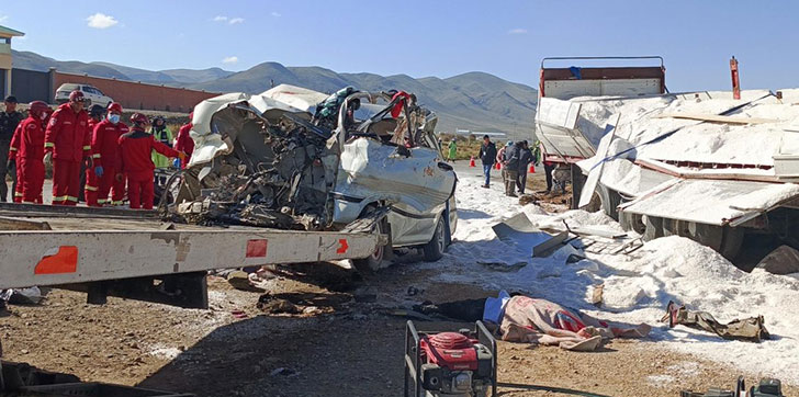 BOLIVIA- Al menos 14 personas fallecieron este jueves y 2 resultaron heridas por el choque de dos vehículos, uno de alto tonelaje que trasladaba sal, en una carretera en el oeste de Bolivia.