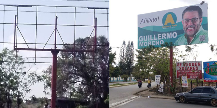 AGENDA56, SAN FRANCISCO DE MACORÍS- Por segunda vez en menos de un mes, una valla publicitaría de Alianza País ubicada en la entrada de San Francisco de Macorís fue vandalizada por desaprensivos, en un acto de intolerancia política.