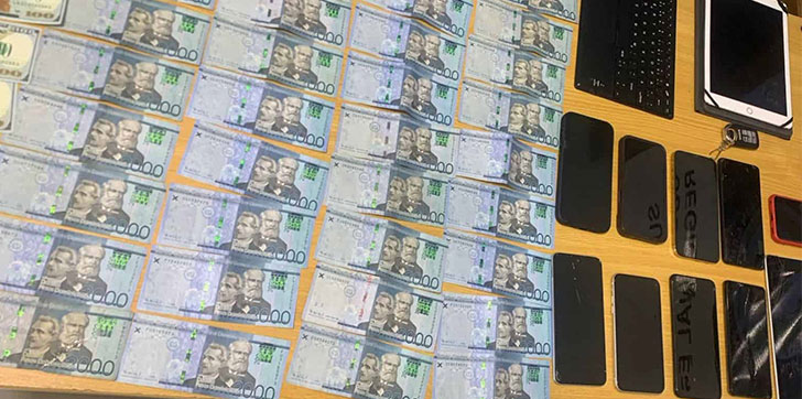 Durante el allanamiento, las autoridades se incautaron de una pistola marca Glock, modelo 23, calibre 40 milímetros, sin documentación legal, RD$80,000 en efectivos, 23,100 dólares en billetes falsos, diez teléfonos celulares, dos tablets, una computadora y un vehículo Honda Accord.