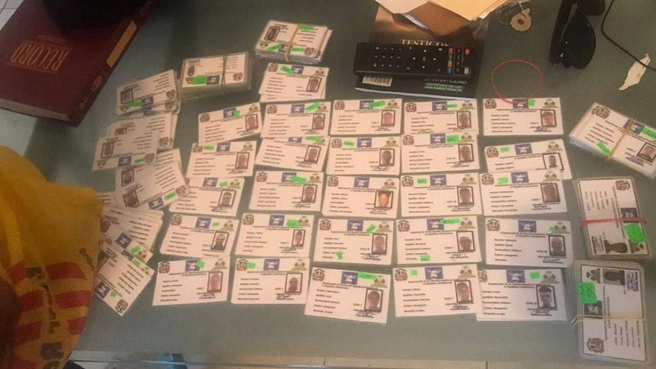 Miembros de la Dirección de Investigaciones Criminales (Dicrim) ocuparon 378 carnet , con los logos del escudo dominicano, la bandera de Haití y con el nombre de Organización de los Jóvenes Populares Haitianos en República Dominicana.