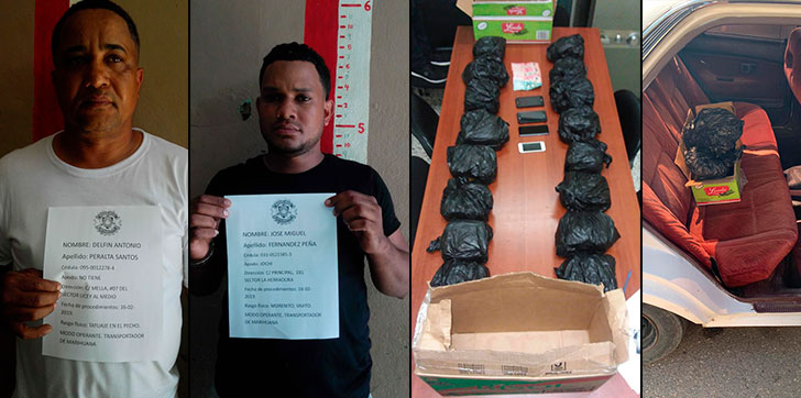 Durante la requisa al vehículo, los policías lograron localizar una caja de cartón conteniendo en su interior ocho pacas de un vegetal verde que por su olor y característica se presume es marihuana, con un peso aproximado de 19,880 gramos.