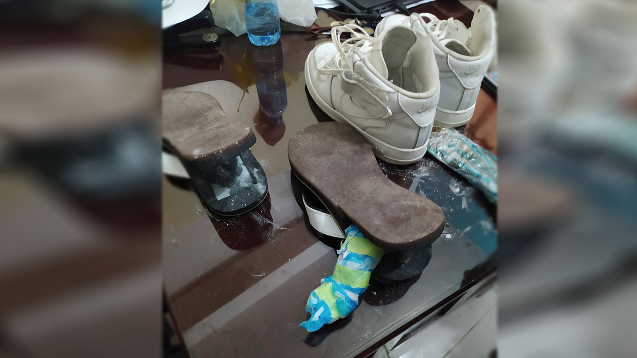 A Rosario Fajardo le fueron ocupados dos plantillas de sandalias con suelas conteniendo incrustadas 165.1 gramos de un vegetal verde que se presume es marihuana y dos porciones grandes de un polvo blanco que se presume es cocaína, con un peso aproximado de 91.2 gramos, la cuales fueron incautadas dentro de un par de tenis