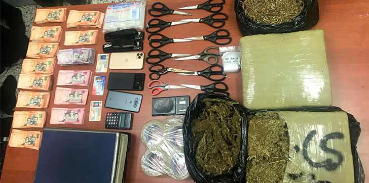 El organismo informó que a los detenidos se les ocuparon en una habitación de la vivienda allanada , 2 pacas de marihuana con un peso de 19 libras y en una mesa , dos porciones más con un peso de 4 libras y media arrojando un peso global de 23 libras y media de la sustancia alucinógena .