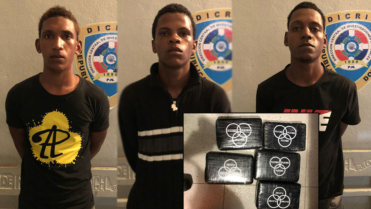 AGENDA56, SAN JUAN.- Miembros de la Policía Nacional apresaron a tres jóvenes en flagrante delito, a quienes le ocuparon cinco paquetes de un vegetal rocoso envuelto con cinta adhesiva, el cual se presume es cocaína.