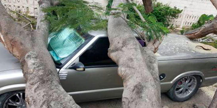 AGENDA56, SANTIAGO.- Una mata de flamboyán cayó de manera sorpresiva sobre dos vehículos la tarde de ayer en la calle Arturo Grullón de la urbanización Jardines Metropolitanos, de esta ciudad, sin que alguna persona resultara herida.
