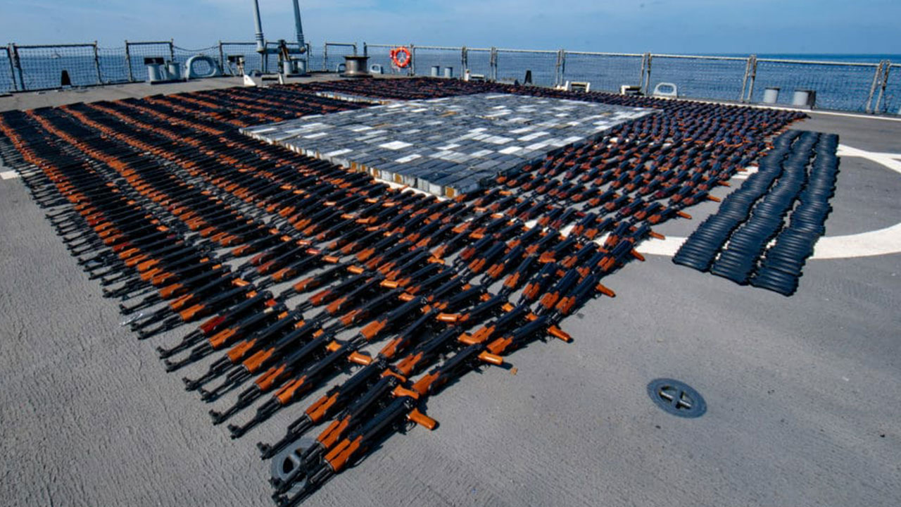 Las fuerzas navales estadounidenses realizan regularmente operaciones de seguridad marítima en el Medio Oriente para garantizar el libre flujo del comercio legítimo y para interrumpir el transporte de carga ilícita que a menudo financia el terrorismo y otras actividades ilícitas. Los buques de guerra de la Armada de los EE. UU. Que operan en la región de la Quinta Flota de los EE. UU. Han incautado aproximadamente 8,700 armas ilícitas en 2021.