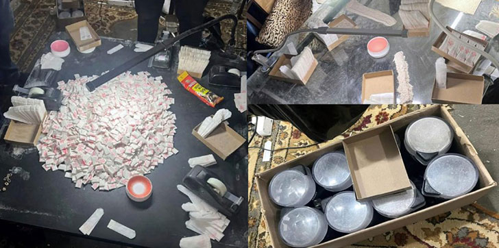 Los investigadores también encontraron varios equipos necesarios para el envasado de medicamentos, incluidas bolsas de agentes cortantes, una caja llena de molinillos de café que contenían una sustancia blanca en polvo, varias básculas y sellos utilizados para la marca.