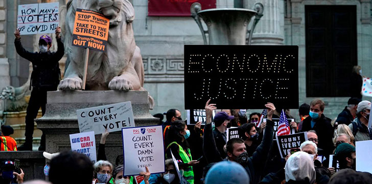 Entre los leones que guardan las puertas del centenario edificio, organizaciones obreras, inmigrantes y políticas se dieron cita para mostrar su rechazo a la petición del equipo electoral de Trump de recontar los votos en el estado de Wisconsin y las amenazas de solicitar ante los tribunales la detención del escrutinio en Michigan y Pensilvania.
