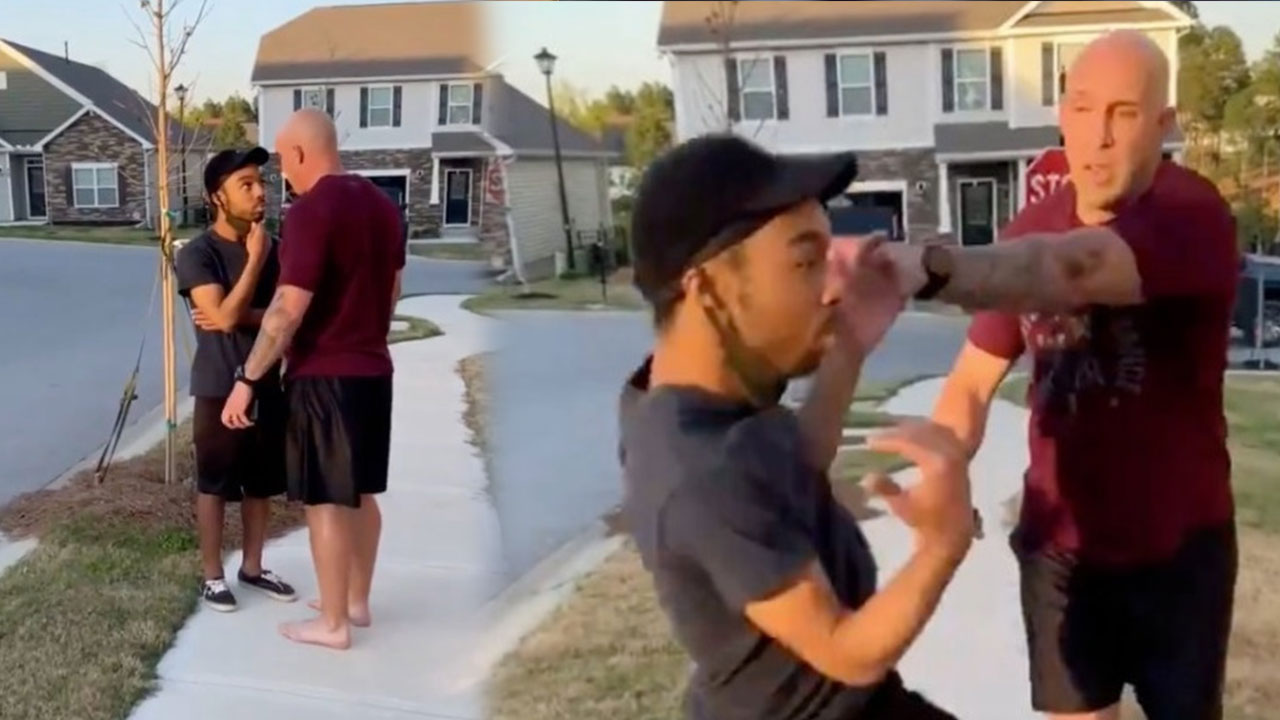 Muestra a Pentland, un sargento del Estado Mayor del Ejército de Estados Unidos estacionado en Fort Jackson, amenazando a un hombre que caminaba en su vecindario en las afueras de Columbia y diciéndole que se fuera.