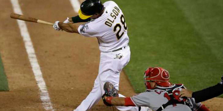 Olson, cuyo lanzamiento desde primera base eliminó a Shohei Ohtani, el corredor libre de los Angelinos, en la parte alta de la última entrada, conectó con un out. Los Atléticos se reunieron en torno al plato para recibirlo en su primer juego de la temporada.