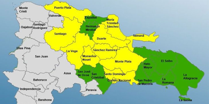 Mientras que en alerta verde están Hermanas Mirabal, San Cristóbal, Espaillat, El Seibo, La Romana, La Altagracia, San Pedro de Macorís, San José de Ocoa y Hato Mayor.
