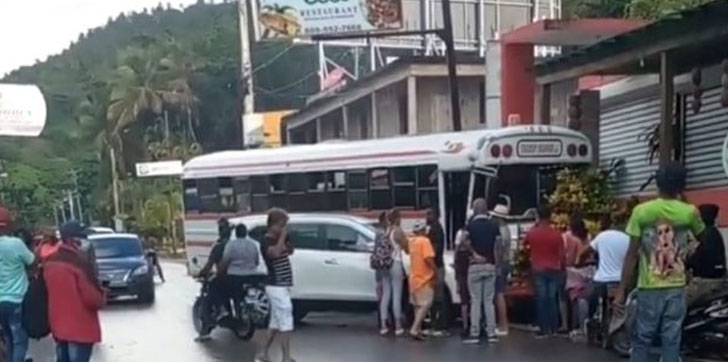 SAMANÁ.– Un autobús cargado de excursionistas que viajaban la mañana de este domingo desde Bonao a Samaná, chocó contra la pared de un restaurante cuando su conductor evitó impactar a una jeepeta en el cruce de Las Terrenas.