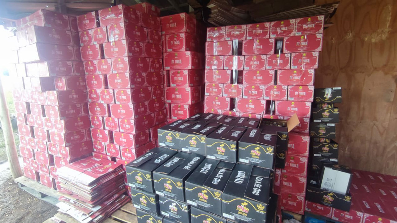 Asimismo, se ocuparon diferentes cajas con logos de bebidas alcohólicas de marcas reconocidas entre ellas 303 cajas vacías, 675 cajas sin armar, 21 rollos de etiquetas, 7 rollos de cintas masking tape, varios paquetes de etiquetas de cuello de botella, 551 cajas de ron de 175 ml de alcohol y 144 de 350 ml, además de tres blowers industrial para poner etiquetas.
