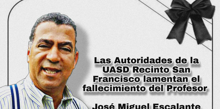DUARTE.- Las autoridades de la Universidad Autónoma de Santo Domingo UASD del Recinto San Francisco de Macorís, en nombre de todo el personal que labora en nuestra Academia expresamos nuestro más profundo dolor por la irreparable partida a destiempo de nuestro gran maestro y entrañable amigo: José Miguel Escalante.
