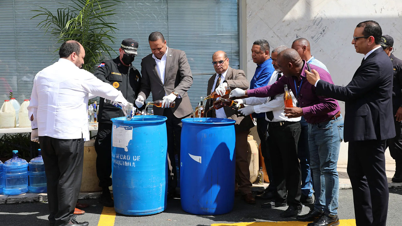 AGENDA56, SANTO DOMINGO.- El Instituto Nacional de Protección de los Derechos del Consumidor (Pro Consumidor) y el Cuerpo Especializado de Control de Combustibles (CECCOM) vertieron este jueves una cantidad enorme de bebidas alcohólicas adulteradas que fueron incautadas en operativos realizados en diferentes provincias del país.