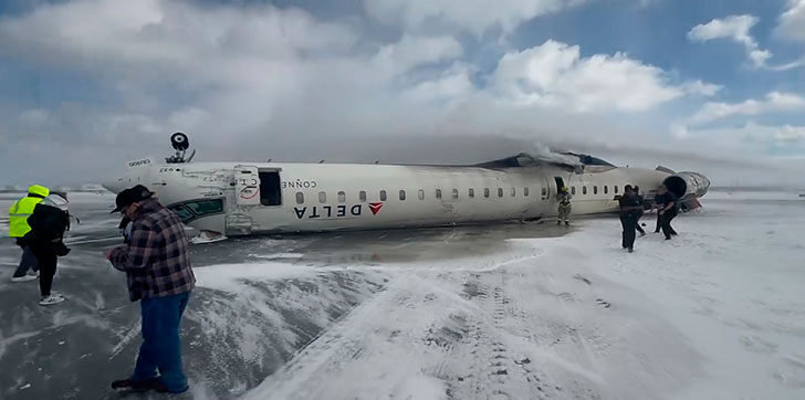 CANADÁ.- Un avión de Delta Airlines se volcó al aterrizar en el Aeropuerto Internacional Pearson de Toronto (Canadá) el lunes, quedando invertido sobre la pista nevada y dejando un saldo de 18 heridos, incluidos tres en estado crítico, según informaron las autoridades.