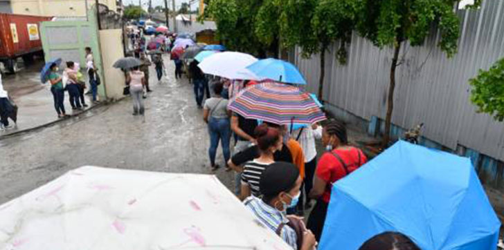 Las personas estaban bajo la lluvia. Muchos tenían paraguas. Las filas eran tan largas que abarcaban varios negocios de la zona.