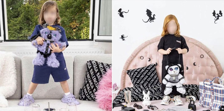 La primera fue una serie de imágenes que mostraban modelos infantiles posando con bolsos de peluche de Balenciaga.