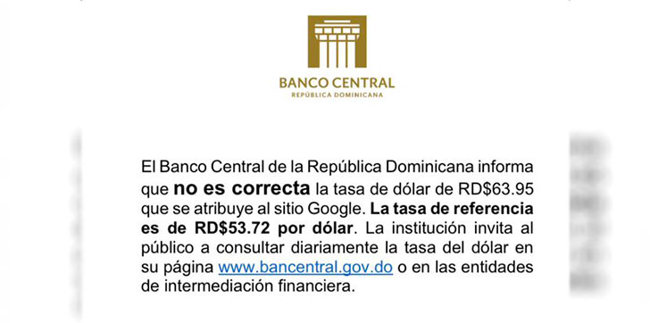 AGENDA56, SANTO DOMINGO.- El Banco Central informó que no es cierta la tasa de dólar que circula en diferentes redes sociales que la coloca por encima de los 60 pesos por cada dólar estadounidense.
