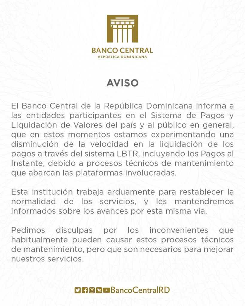 AGENDA56, SANTO DOMINGO. – El Banco Central informó este martes que experimenta una disminución de la velocidad en la liquidación de los pagos a través del sistema LBTR, incluyendo los pagos al instante.