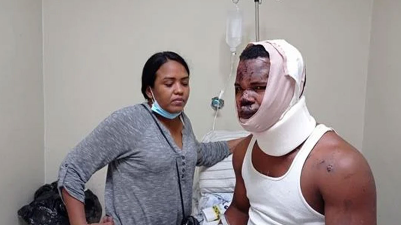 En la sala de emergencias del Hospital Regional Universitario Jaime Mota, el camionero dominicano Víctor Alfonso Alcántara Figuereo, es cuidado por su pareja mientras le tratan las heridas de bala, y por un accidente de tránsito que ambos sufrieron en Haití.