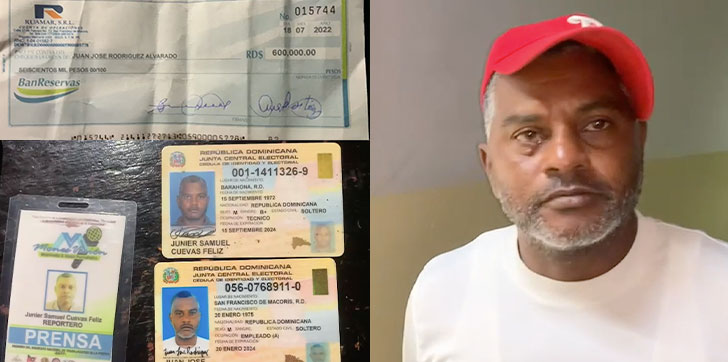 Se trata del nombrado Junier Samuel Cuevas Feliz, de 49 años, a quien se le ocupó el cheque, dos cédulas y un carnet de prensa. El detenido dijo que reside en la ciudad capital.