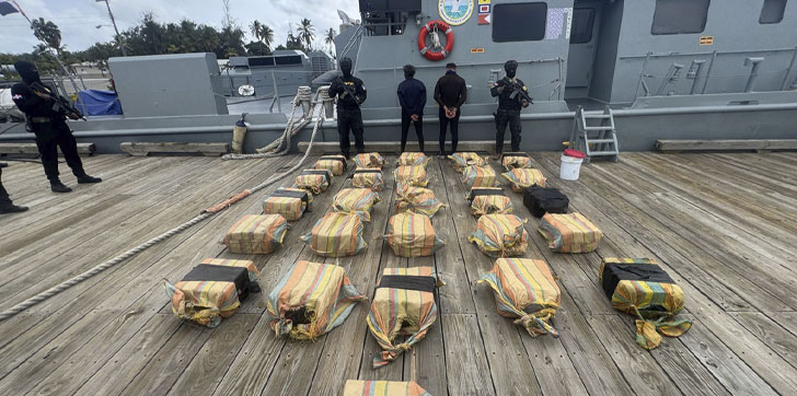 Al abordar la lancha, que se presume llegó procedente de Sudamérica, las autoridades arrestaron a dos dominicanos y confiscaron 26 sacos, conteniendo un total de 650 paquetes de la supuesta cocaína, envueltos en cinta adhesiva y con varios logotipos.