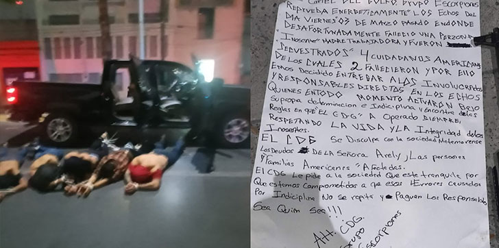 “El Cártel del Golfo, Grupo Escorpiones, reprueba energéticamente los hechos del día viernes 3 de marzo pasado, en donde desafortunadamente falleció una persona inocente madre trabajadora y fueron secuestrados 4 ciudadanos americanos, de los cuales 2 fallecieron, por ello hemos decidido entregar a los involucrados y responsables directos en los hechos, quienes en todo momento actuaron bajo su propia determinación e indisciplina”, decía la primera parte del mensaje hallado junto a los cinco hombres que aparecieron en una fotografía amarrados de las manos.