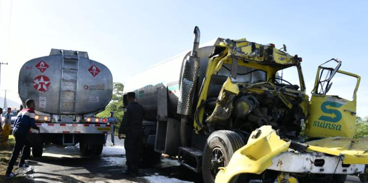 El accidente se produjo cuando un camión cargado de gasolina, impactó a otro que iba lleno de sacos de harina, quedando el cabezote del tanquero totalmente destruido.