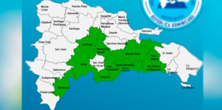 Las provincias en alerta verde son: Barahona, el Gran Santo Domingo, Monseñor Nouel, Peravia, San Cristóbal, La Vega, Hato Mayor, San Pedro de Macorís, Monte Plata y Azua,