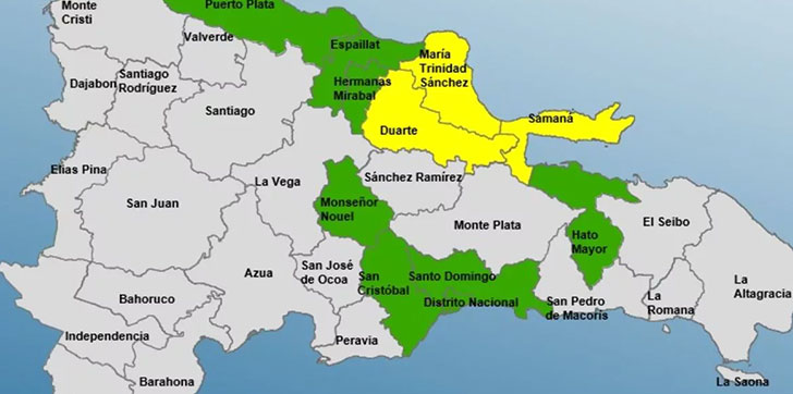 En ese sentido, el COE aumentó de siete a once las provincias bajo, en amarillo se encuentran Duarte, Samaná y María Trinidad Sánchez; mientras que en verde se encuentran Hermanas Mirabal, Monseñor Nouel, Puerto Plata, Espaillat, Hato Mayor, San Cristóbal, Santo Domingo y el Distrito Nacional.