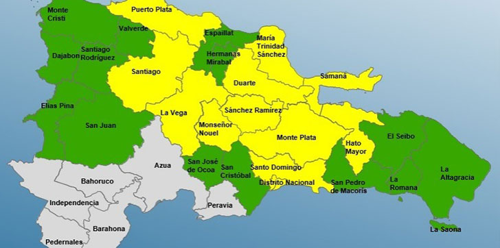 Las provincias en alerta amarilla son: María Trinidad Sánchez, La Vega, Monseñor Nouel, Puerto Plata, Santo Domingo, Distrito Nacional, Duarte, Sánchez Ramírez, Monte Plata, Santiago, Samaná y Hato Mayor.