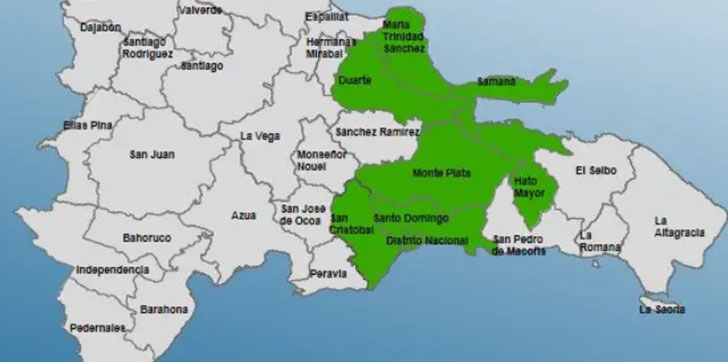 Las provincias en alerta verde son: Distrito Nacional, Santo Domingo, San Cristóbal, Hato Mayor, Monte Plata, Duarte, Samaná y María Trinidad Sánchez.