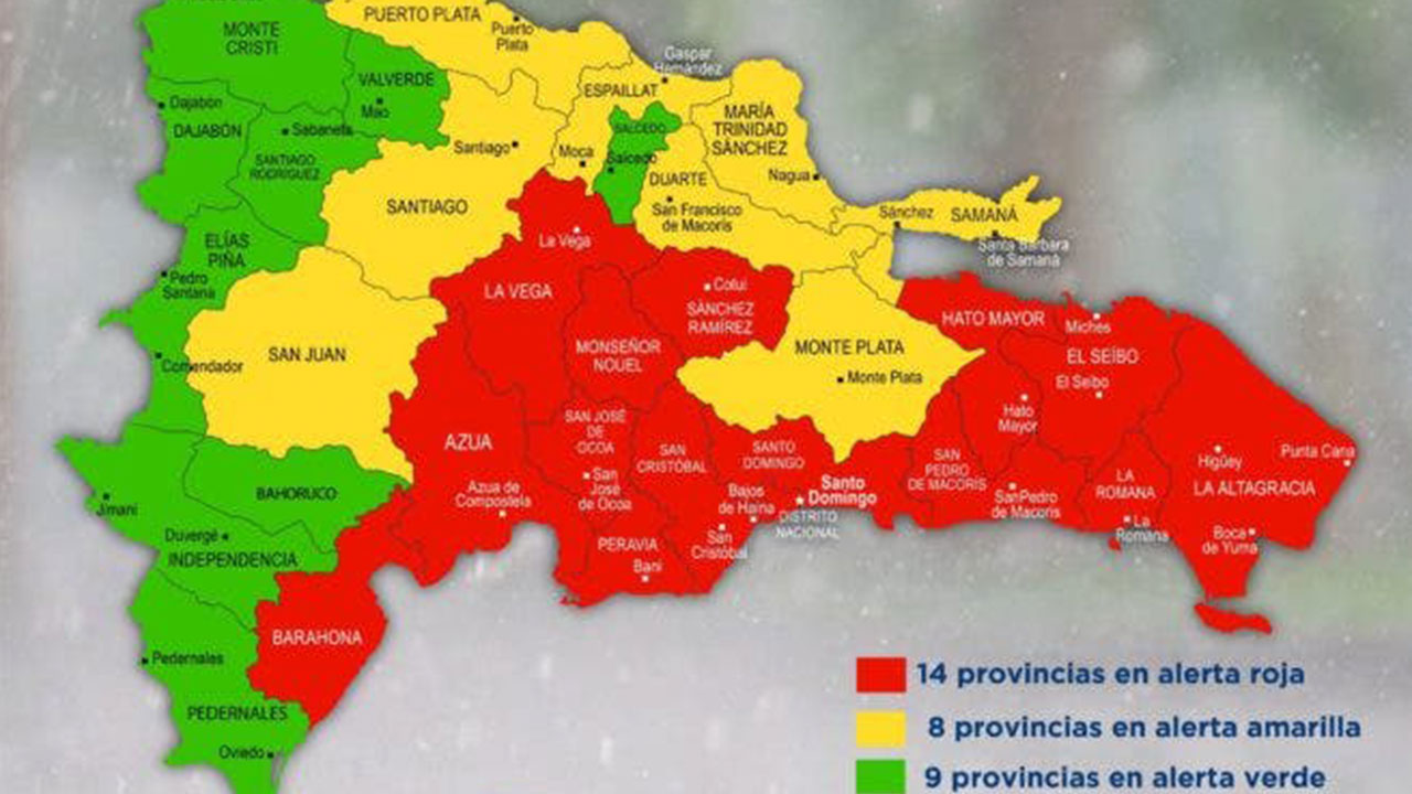 Las provincias en alerta roja son: La Altagracia, La Romana, el Gran Santo Domingo, San Pedro de Macorís, El Seibo, San Cristóbal, Monseñor Nouel, San José de Ocoa, Hato Mayor, Azua, Peravia, Barahona, Sánchez Ramírez y La Vega.