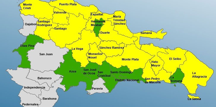 Las provincias en alerta amarilla son: María Trinidad Sánchez, La Altagracia, Monseñor Nouel, Montecristi, San Pedro de Macorís, Santiago Rodríguez, Duarte, Sánchez Ramírez, Monte Plata, Puerto Plata, Valverde, Hato Mayor, Espaillat, La Vega, Santiago, Samaná y El Seibo.
