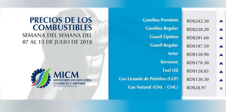 SANTO DOMINGO.- Todos los combustibles derivados del petróleo subirán entre tres y cinco pesos por galón durante la semana del 7 al 13 de julio de 2018, siguiendo una tendencia alcista en los mercados internacionales.