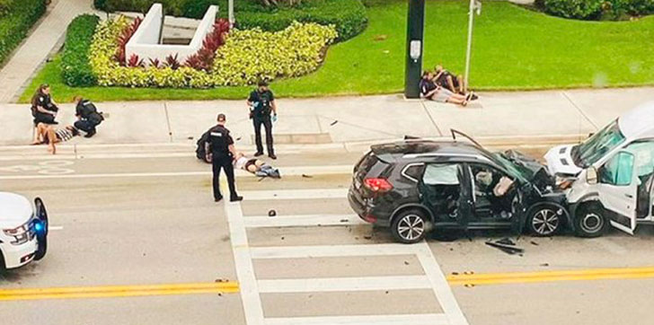Las imágenes del caos posterior al choque muestran las partes delanteras de ambos vehículos gravemente dañadas en una intersección concurrida con cuatro personas sentadas o acostadas cerca.