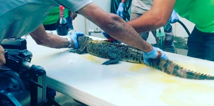 SANTO DOMINGO.- Con signos de debilidad y en un alto estado de estrés llegó al Parque Zoológico Nacional “Coqui”, el cocodrilo que durante varios días merodeó una cañada en el sector Barrio Nuevo, de Sabana Perdida y que fue capturado este sábado.