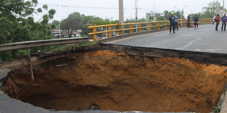 “Aparentemente las lluvias provocaron este hundimiento”, agregó el uniformado. El accidente dejó un boquete de unos cinco metros de profundidad en la calzada, según las imágenes.