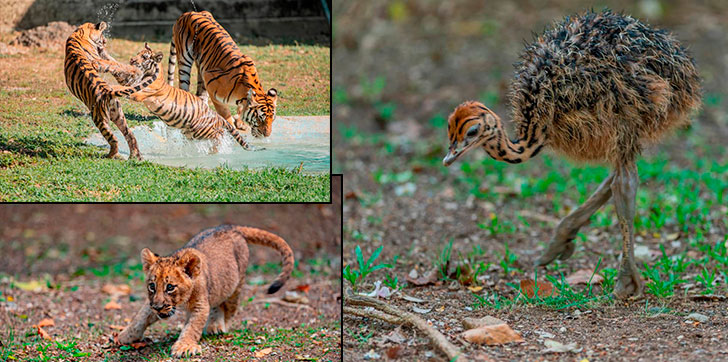 Estos nacimientos se han producido de manera natural y asistida, y la crianza de los nuevos miembros del parque ha estado, en el caso de los tigres, bajo el cuidado de su madre; mientras que en el del cachorro de león y el avestruz, de un médico veterinario y de dos biólogas.