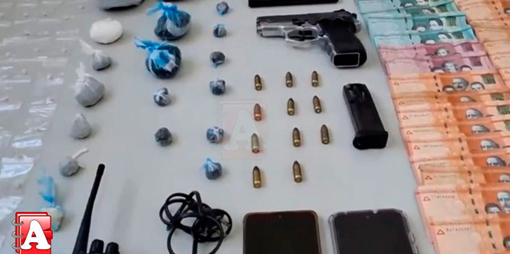 Una pistola marca Bersa, calibre 9mm, color negro con plateado, con su cargador de manera ilegal, once cápsulas calibre 9mm, 102 porciones de un material rocoso presumiblemente crack, 19 porciones de un vegetal presumiblemente marihuana, una porción de un polvo blanco presumiblemente cocaína, una balanza, un radio de comunicación tipo walkie-talkie y su cargador.