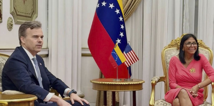 Con el recibimiento del diplomático y su equipo, Rodríguez «reafirma su deseo de establecer relaciones de cooperación, hermandad y desarrollo mutuo» con EE.UU., agregó VTV.