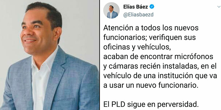 AGENDA56, SANTO DOMINGO.– El diputado del Partido Revolucionario Moderno, Elías Báez, denunció esta tarde que supuestamente fueron encontrados micrófonos y cámaras en un vehículo perteneciente a una institución pública.
